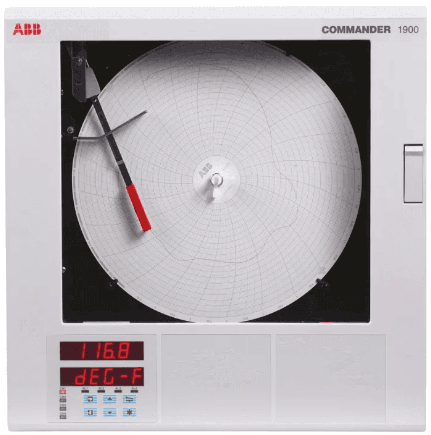 SpecificationsBrandABBChart TypeCircularNumber of Inputs1Parameter MeasuredCurrent, Millivolt, Resistance, Temperature, VoltageMaximum Temperature Measurement+1100 °F, +1300 °C, +1650 °F, +1700 °C, +1800 °C, +2350 (N) °F, +300 °C, +3000 (R) °F, +3270 (B) °F, +550 °F, +600 °C, +900 °CNumber of Outputs1Maximum Current Measurement50mAMaximum Operating Voltage230V acMaximum Resistance Measurement750 ï¿« 10000ΩMaximum Voltage Measurement+5VRecorder Input TypemA, mV, RTD, Thermocouple, VModel Number pC1912IP RatingIP66Best Temperature Measurement Accuracy±0.5 °CTemperature Measurement Resolution0.1%Power SourceMainsWidth134mmLength382mmResistance Measurement Resolution0.1%Height386mmBest Current Measurement Accuracy±0.2 %Current Measurement Resolution0.1 %Weight8.2kgMinimum Operating Voltage115V acBest Voltage Measurement Accuracy±0.1 ¾st Resistance Measurement Accuracy±0.5 %Voltage Measurement Resolution0.1%Country of OriginGBNumber of Outputs1Maximum Current Measurement50mAMaximum Operating Voltage230V acMaximum Resistance Measurement750 ï¿« 10000ΩMaximum Voltage Measurement+5VRecorder Input TypemA, mV, RTD, Thermocouple, VModel Number pC1912IP RatingIP66Best Temperature Measurement Accuracy±0.5 °CTemperature Measurement Resolution0.1%Power SourceMainsWidth134mmLength382mmResistance Measurement Resolution0.1%Height386mmBest Current Measurement Accuracy±0.2 %Current Measurement Resolution0.1 %Weight8.2kgMinimum Operating Voltage115V acBest Voltage Measurement Accuracy±0.1 ¾st Resistance Measurement Accuracy±0.5 %Voltage Measurement Resolution0.1%Country of OriginGB